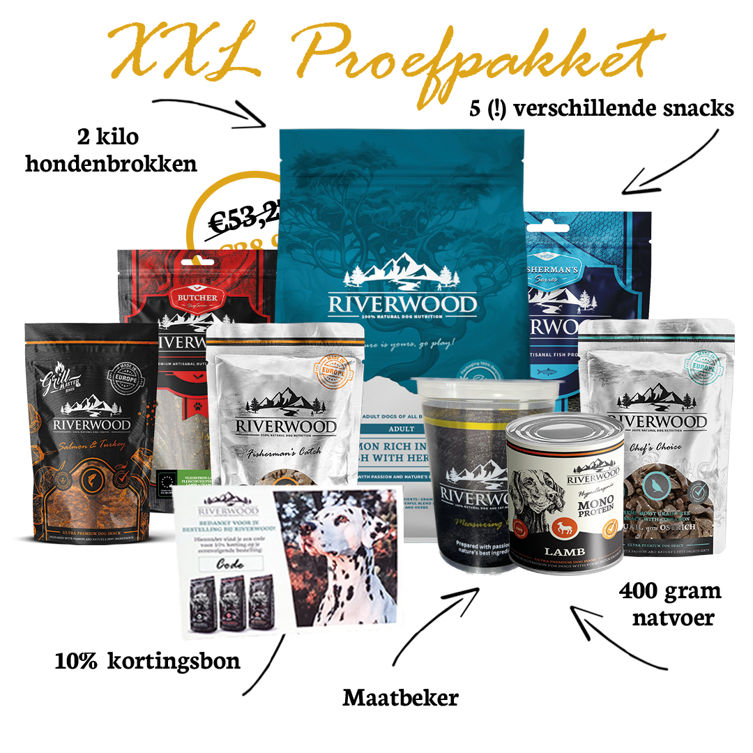 Inhoud Proefpakket XL: 2 kilo brokken, 400 gram natvoer, 1x zakje snacks